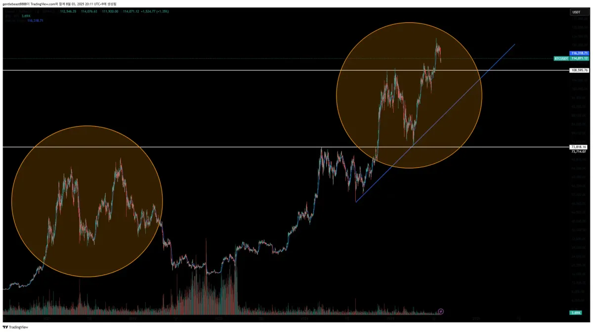 다만 2021년은 쌍봉을 그리는데 시간이 더 투여되었다면, 2025년은 조정의 폭이 상대적으로 짧은채고 슈팅을 주는 모습이다.