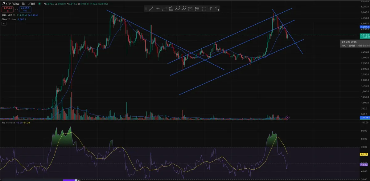 배운 내용을 실제 차트에 적용해보고 싶어서 XRP 차트를 기반으로 선들을 직접 그려보며 모의 트레이딩을 진행해봤습니다.