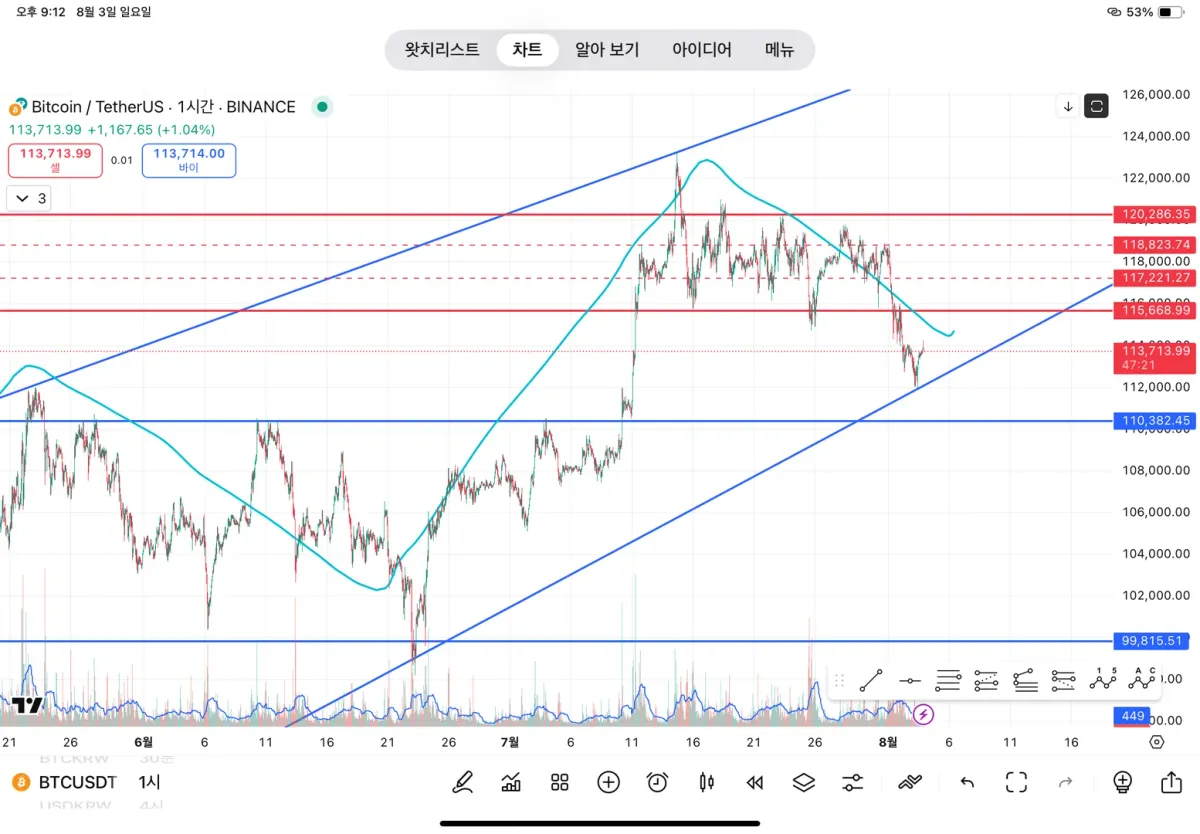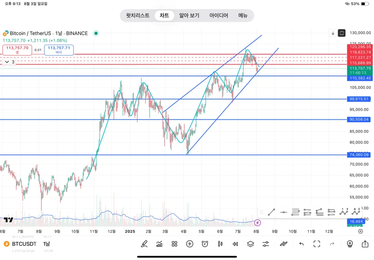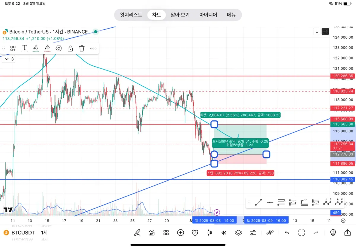 크게 봤을 때 상향 추세이며, 상승 쐐기가 있어 장기적으로는 하락하겠지만 추세선에 닿아 지지를 받았다는 점, 큰 하락 이후의 파동 모양을 봤을 때 엘리어트 파동 중 5파동이 나올 것을 기대할 수 있다는 점을 근거로 매수했으며, 장기적으로는 하락의 가능성도 있기에 위의 저항선을 익절 위치로 선정했습니다. 손절 위치는 더이상 추세선의 지지를 받지 못하고 이전 저점을 돌파하는 위치로 결정했습니다.