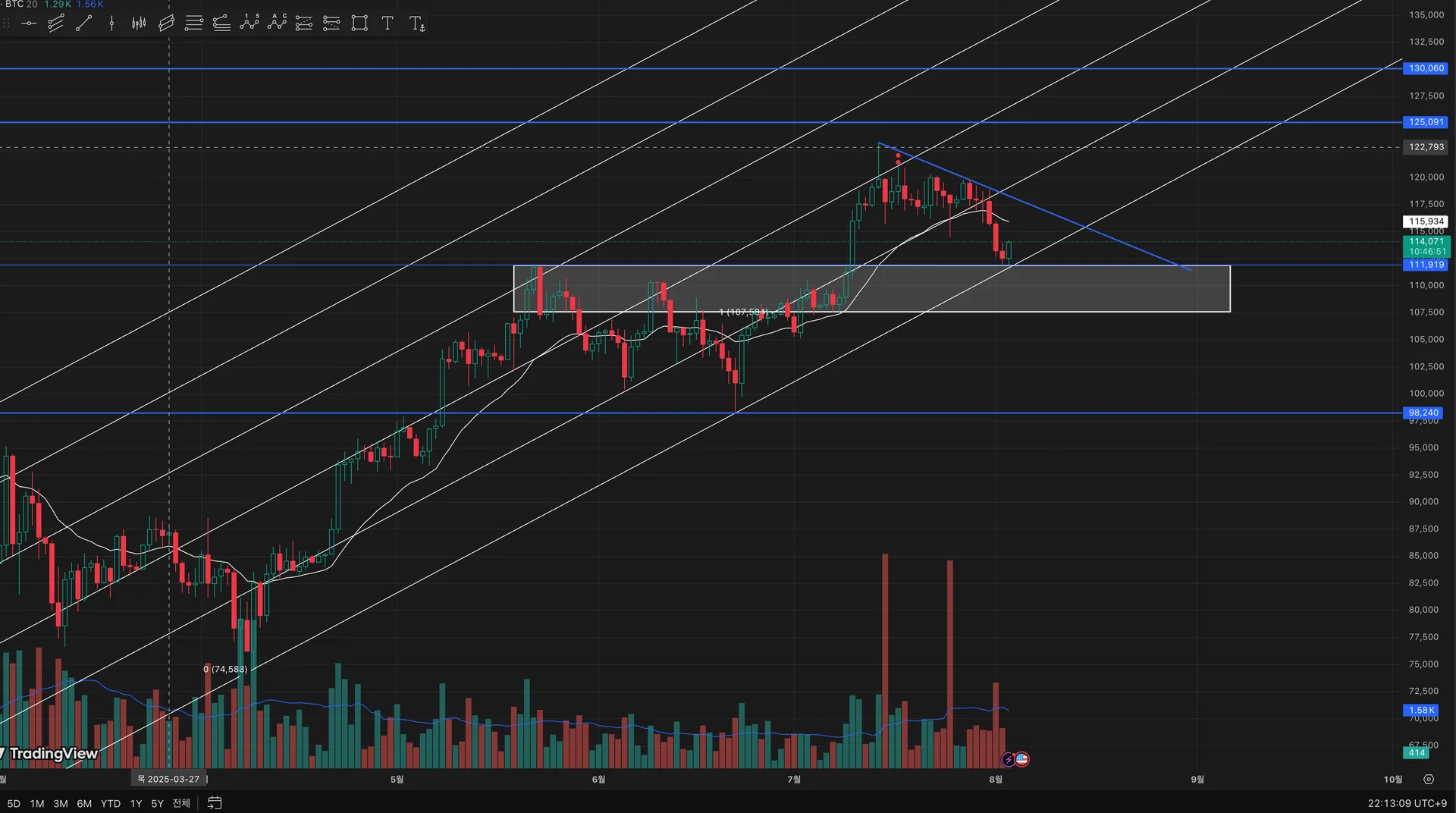 하락 후 지지선 리테스트 하여 횡보하는 듯 합니다. 그러나 장기적 상승 추세로 보이며 상승 추세선을 터치하며 진행 된다면 다시 한번 신고가 테스트 할 것으로 보입니다.