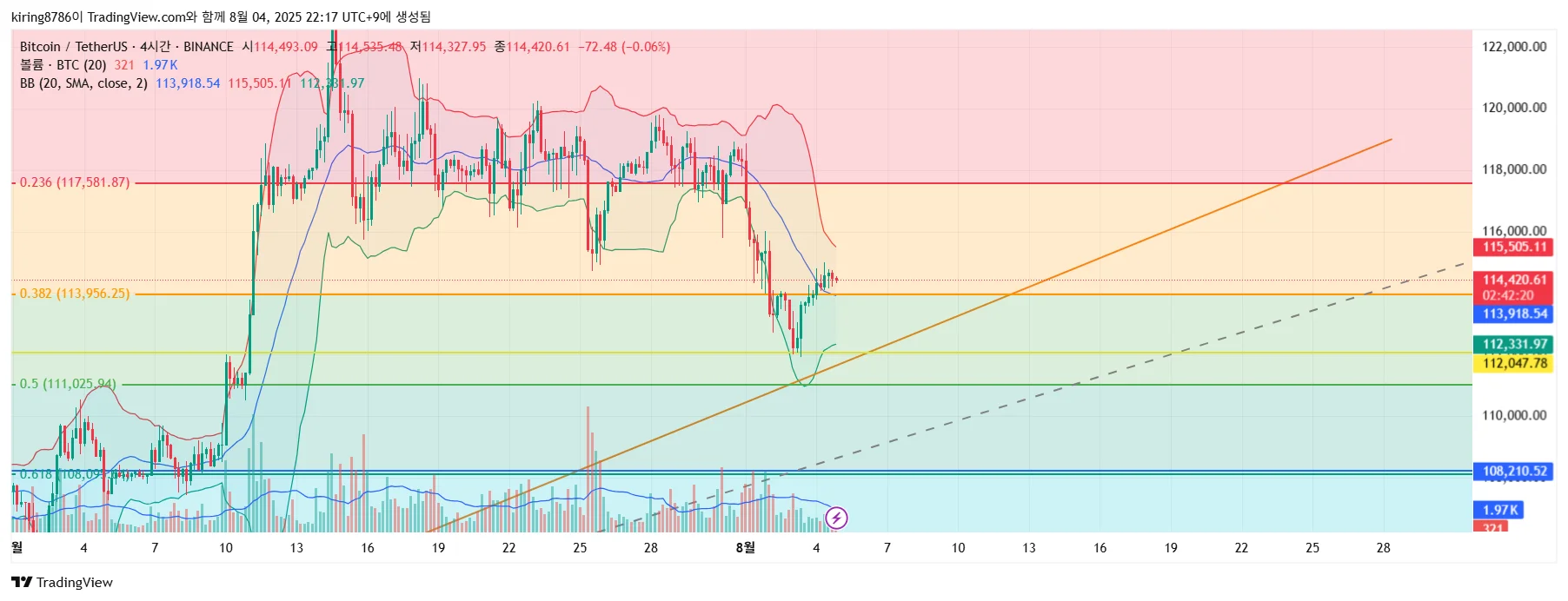 주황색부근 114000에 진입한 후 스탑로스는 초록색부분에 걸어놓고 익절은 빨간색 부분까지 걸어놓을꺼 같습니다.