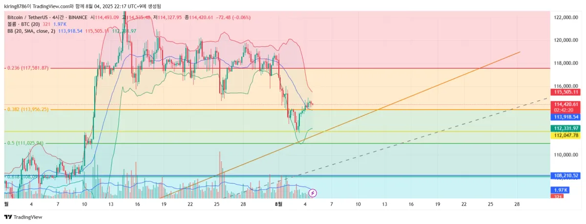 주황색부근 114000에 진입한 후 스탑로스는 초록색부분에 걸어놓고 익절은 빨간색 부분까지 걸어놓을꺼 같습니다.