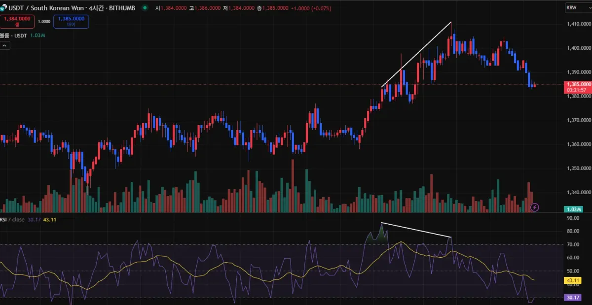 가격은 상승 추세를 보이는 반면 RSI는 내려가고 있고 그 시점을 지나 가격도 하락하고 있습니다.