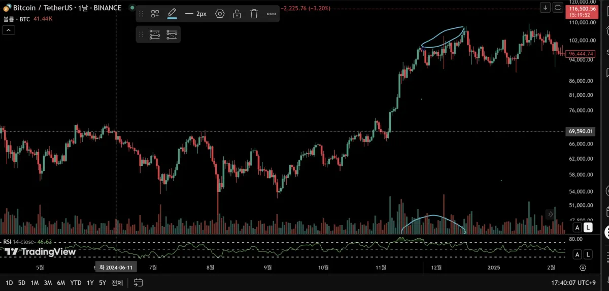 24년 11월 23~ 12월 17일 차트에 표시된 부분을 보면 가격이 신고가를 갱신한 반면에 RSI지수는 떨어진 것을 확인할 수 있습니다.