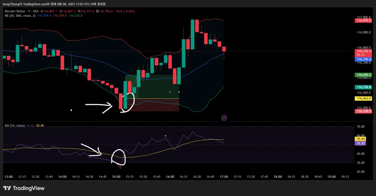• 진입근거 : 4시간, 1시간, 15분봉에서 추세선으로 상승추세 확인 / 5분봉에서 볼린져 밴드 하단을 장대음봉이 터치하고 rsi 30 이하 과매도 구간과 겹쳐 볼밴 중심선으로 회귀할 것으로 판단, 기댜리다 음봉을 압도하는 장대양봉이 출연하므로 진입