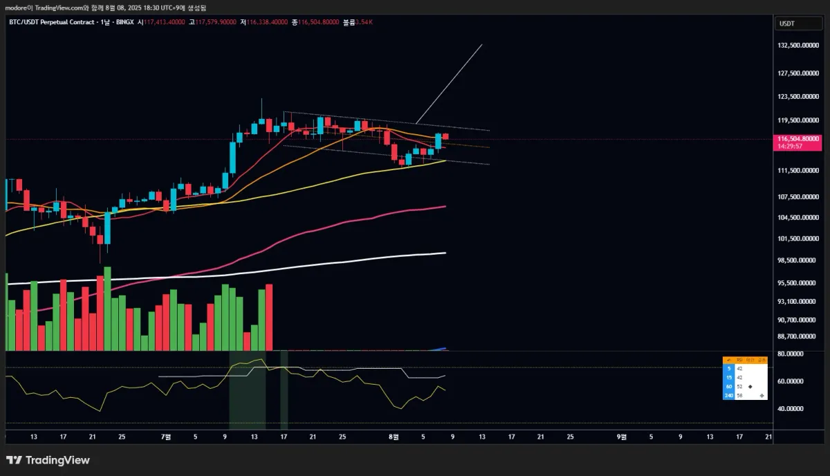 날봉으로 불 플래로 보고 전 매매에서 숏으로 진입후 채널 하단에서 시드50% 롱스위칭함!