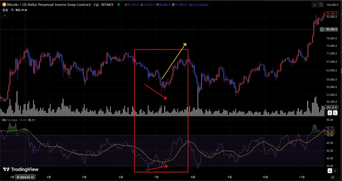 주가는 하락이지만, RSI 저점은 높아져 조만간 상승이 다가옴을 알 수 있는 구간이었습니다.