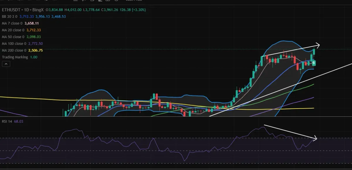 배운대로라면 가격은상승하는데 RSI가 하락이면 하락다이버전스인데 이평선이 정배열이고 과매수구간은 아니라서 더 상승할 여지가 있다고 될까요???