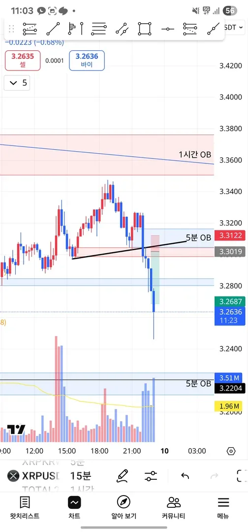 익절값은 1:1값으로 잡았고 하락 중간에 5분봉 OB에서 가격거부반응이 일어나 캔들이 약간 횡보했지만 다행히 익절값 돌파해서 완익했습니다. 럭키~