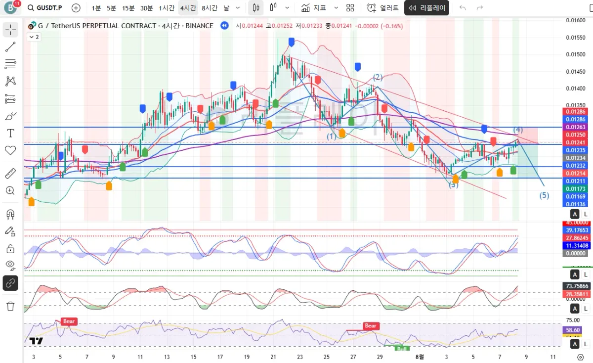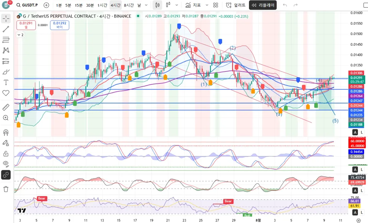0.0123700에 포지션 숏으로 진입하였고, 익절가 0.0113800 손절가 0.0128600으로 손익비 1:2로 진입하였습니다.