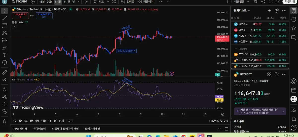 차트에선 고점이 약간의 상승이 보이고 RSI지표에선 약간의 하락이 보여 하락 다이버전스라 생각을 했습니다.