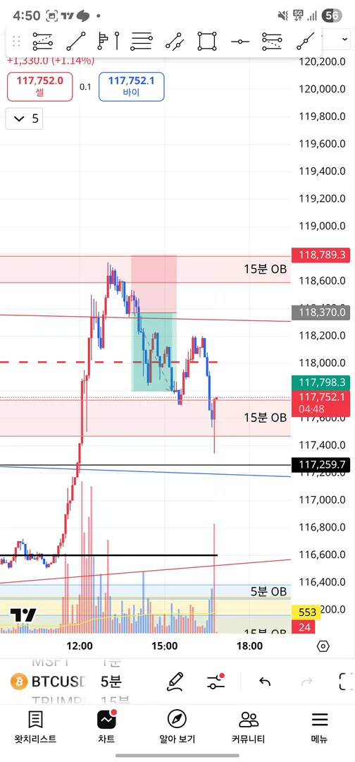 거래량 알림이 수차례 동반되며 급격한 가격상승이 있었고 밑에 오더블럭에서 가격거부반응이 없다시피하며 바로 위 오더블럭까지 꽂았습니다.