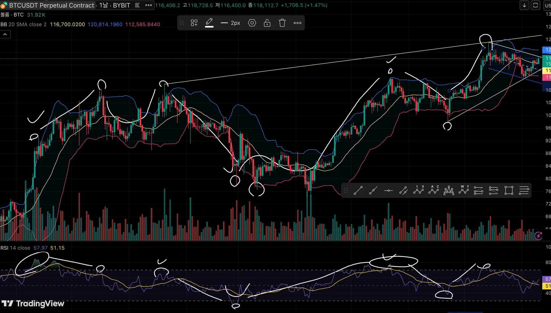현 시점 으로 보았을땐 RSI 상승되며 가격 하락이 있었고 하단 영역에서 가격의 급격한 상승으로 매수가 다시 높아져 RSI가 상승하였고, 당분간 조정 및 하락이 예상합니다.