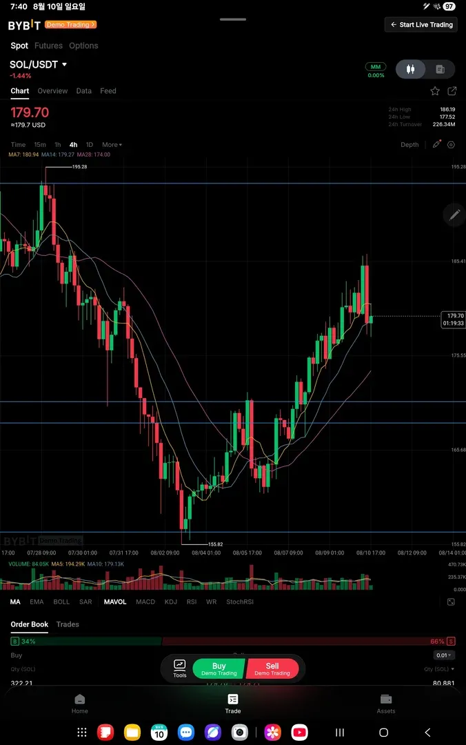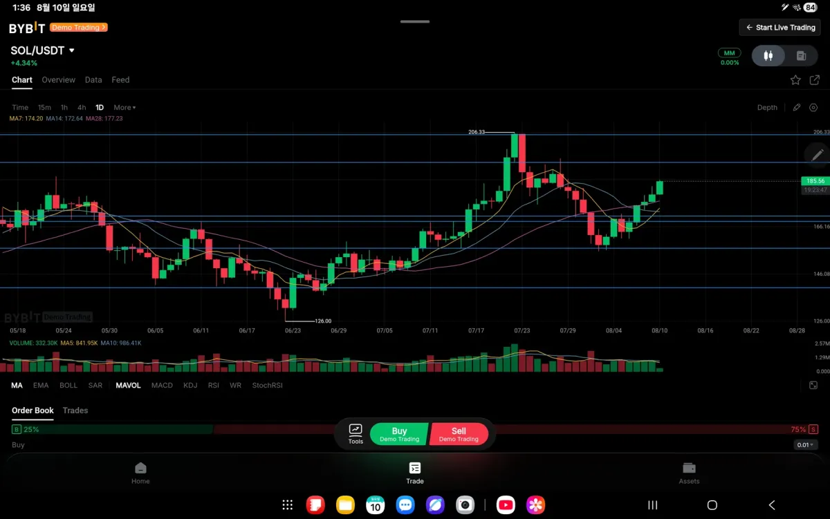 상승 추세를 타고 있었고, 미리 그어놓은 지지, 저항선을 향해 상승하고 있었기 때문에 돌파한다면 조금 더 추세를 지켜보고, 돌파하지 못한다면 바로 익절치려는 생각으로 트레이딩을 진행했습니다. 아쉽게도 돌파는 못해서 바로 팔았어요.