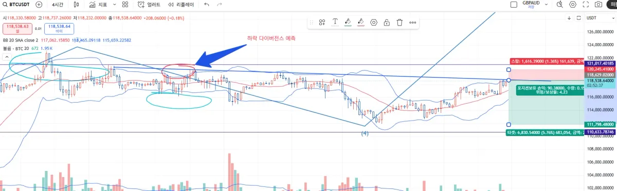 4시간봉으로 이전 고점을 손절라인으로 잡고 현재가에 숏포지션 목표는 이전 저점으로 손익비 잡앗습니다.