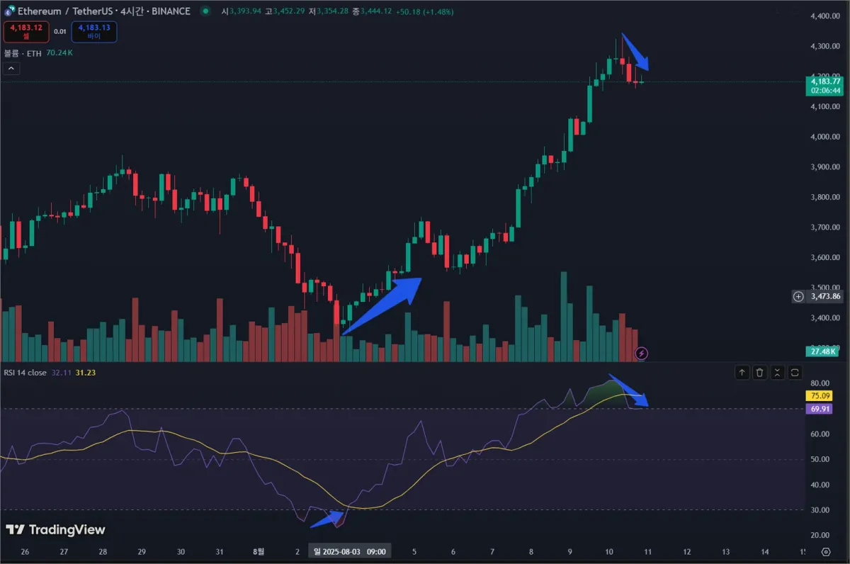 이더 4시간봉을 보니 RSI 30이하로 떨어졌다 오를때 가격이 상승하였고 현재 과매수 포지션에서 70이하로 들어올지 방향성을 나타내고 있습니다.