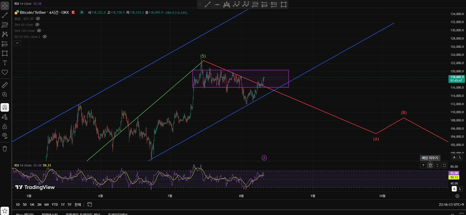 기존에 세웠던 피보나치 되돌림을 깨버리는 상승이 나왔으며, 파란색 상승추세선의 지지와 a파 돌파의 강한 힘을 보여주었음, 현재 보라색 박스권 횡보구간으로 이점을 중점적으로 두며,