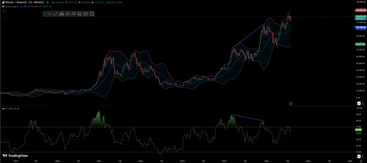 다이버전스를 일봉에서 찾으려고 하다가 실패해서 주봉으로 찾아봤습니다... 아직 볼린저 밴드는 어색하네요!