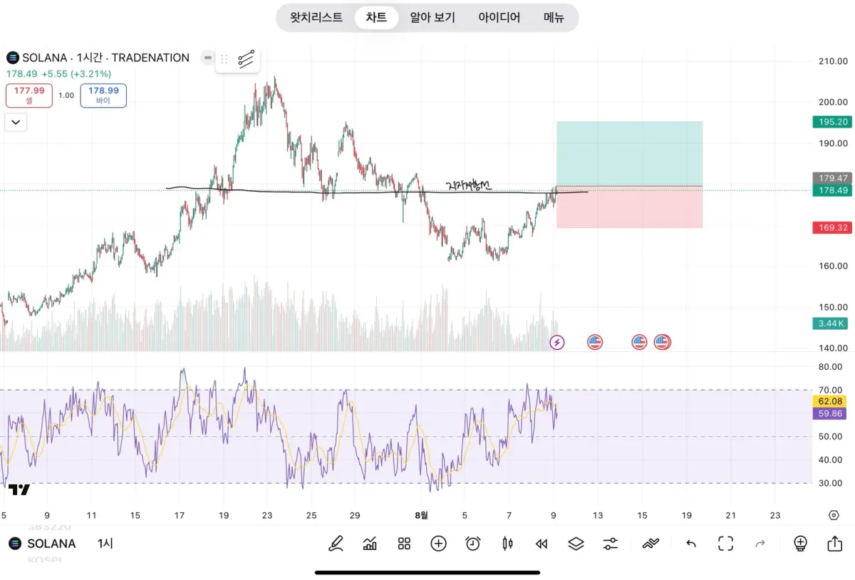 1시간봉은 탠들이 지지저항선을 터치하고 어떻게 변동이 될지에 따라 매수를 결정 할 것 같습니다.
