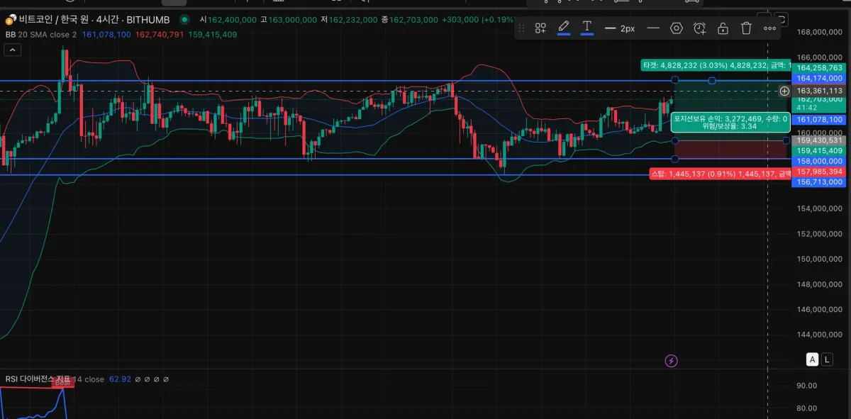 현재 볼린저 밴드 닿는 부근에서 진입하고, 전 저점과 고점에 손절/익절 설정