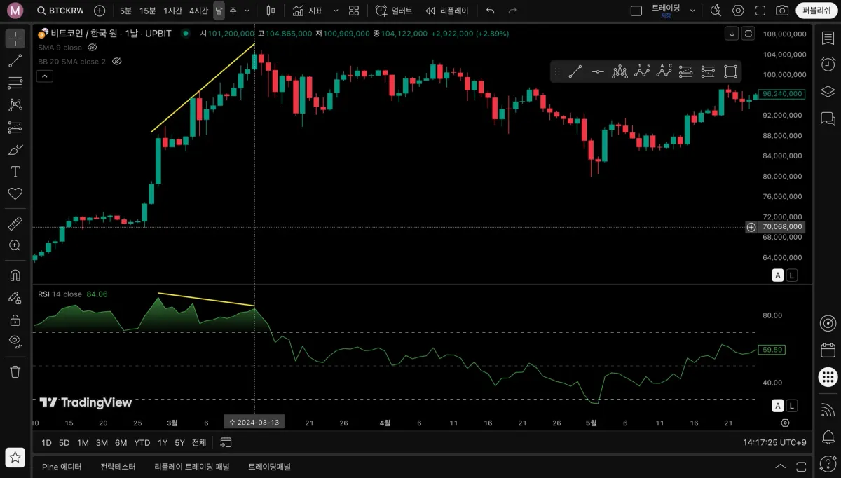 차트는 상승선을 보이고 있는데 RSI 지표는 하락세를 보이고 있어서 이부분이 다이버전스 구간 인 것 같아서 올립니다!