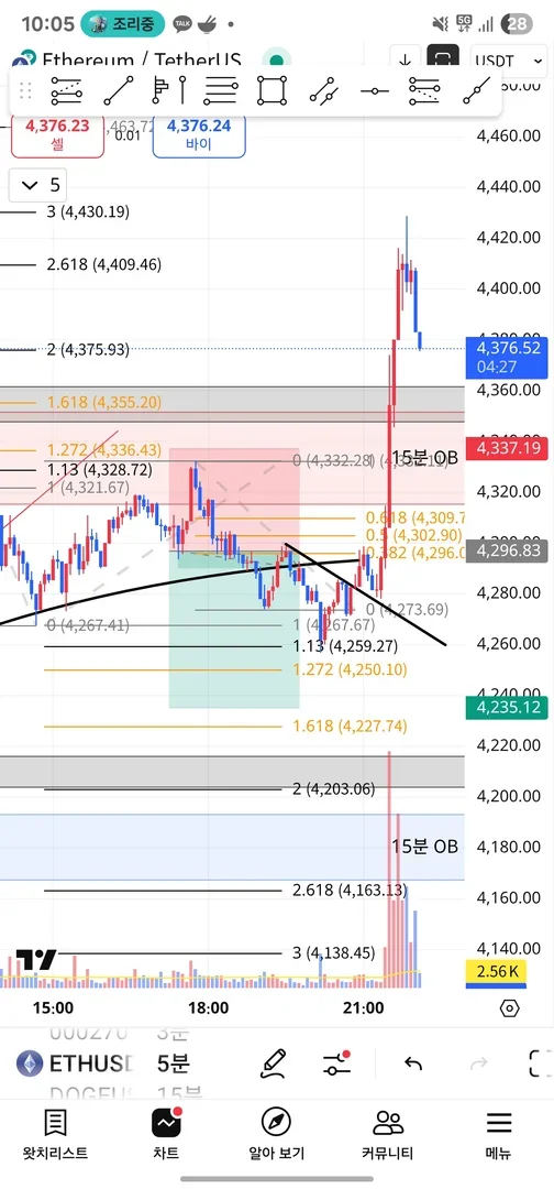 최근 이더가 아래위로 횡보를 해서 숏 자리 기다리던 중 더블탑이 완성됐고 숏 진입했습니다.