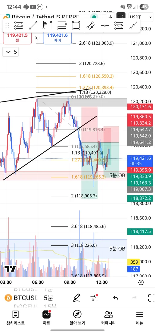 1.272부근에서 1차 익절하고 1.618에서 망치형 캔들이 나오며 양봉출현 후 상승세를 보이는 것 같아 완익했습니다.