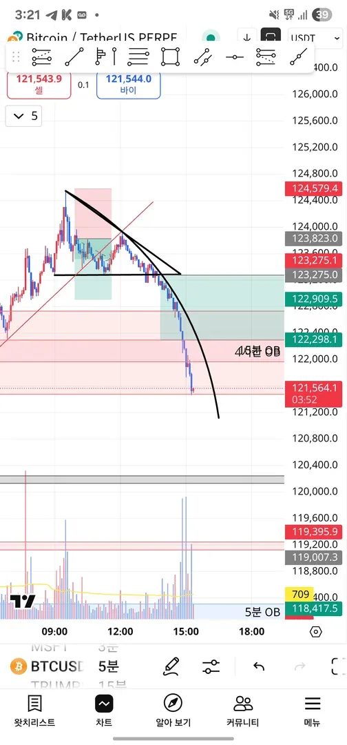 조금 더 지켜보다 조정이 확실하다 싶어서 일단 숏포지션 진입했고 캔들 흐름 보다보니 디센딩이 만들어져서 익절 라인을 디센딩에 맞춰서 더 길게 조정했고 원래 익절라인에서 1차 분익하고 마지막에 거래량 다시 동반되며 완익했습니다.