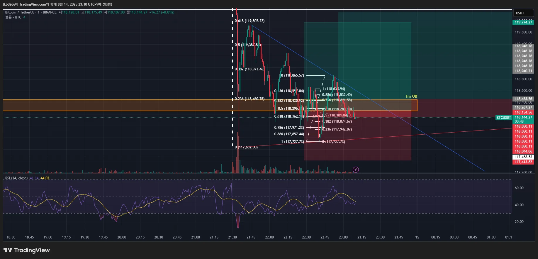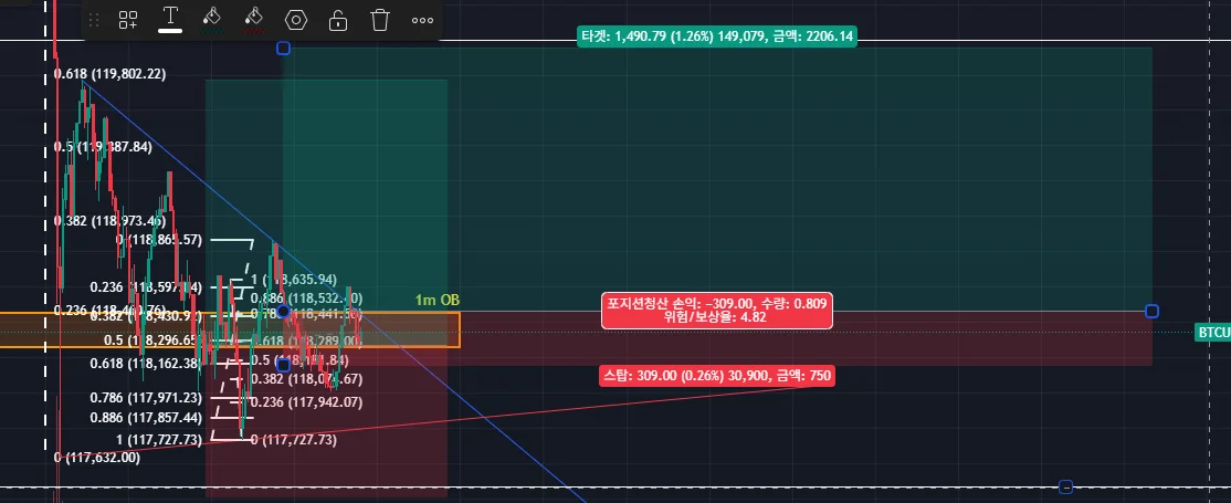 심리: 이번에는 손으로 끊지 않으려고 하였지만 하락 하는 것을 보고 하락 추세선도 안 긋고 그냥 진입하였다가 0.26% 손실거리라 손절 터치 큰 손실.
