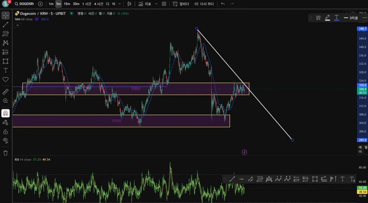 지지 저항선을 표시했고 추세선을 그어본 결과 현재 5분봉으로 봤을때 떨어지지 않을까 예상합니다.
