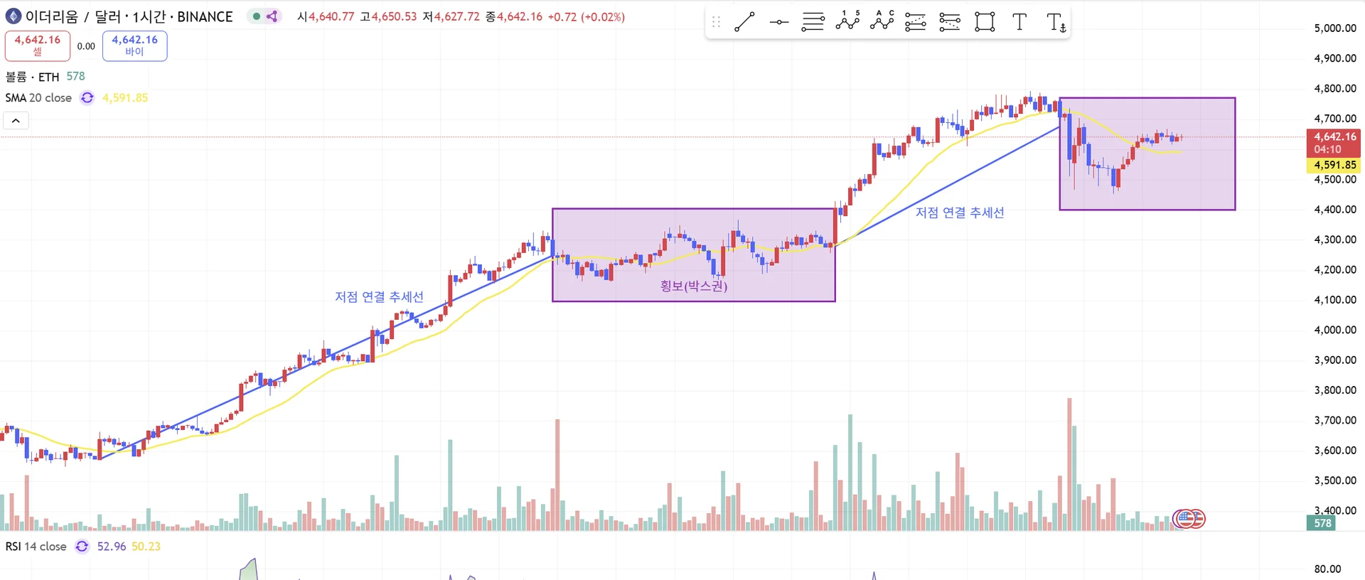 안녕하세요. 배운 내용을 토대로 이더리움을 1시간 단위 캔들을 분석해보았습니다.