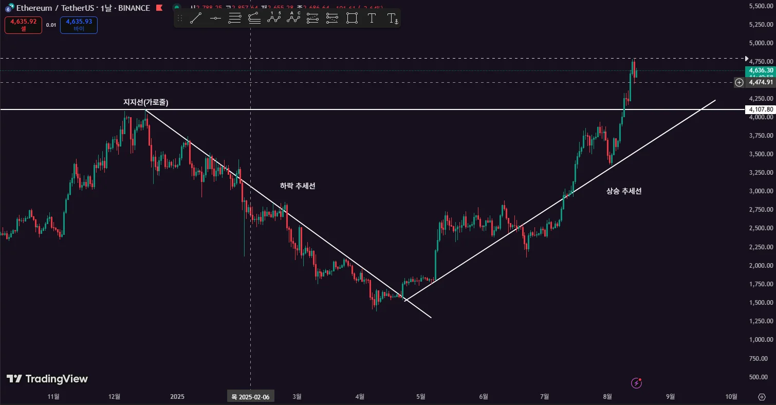 이더리움 일봉차트 입니다. 24년 12월 고점을 기준으로 하락 추세선의 저항을 받아 떨어지는 하락 추세를 보이다가 5월 즈음부터 반등이 시작되더니 상승 추세선을 따라 지지를 받는 상승 추세를 보이는 와중에 결국 24년 고점이었던 지지선을 뚫고 쭉 상승 중입니다.