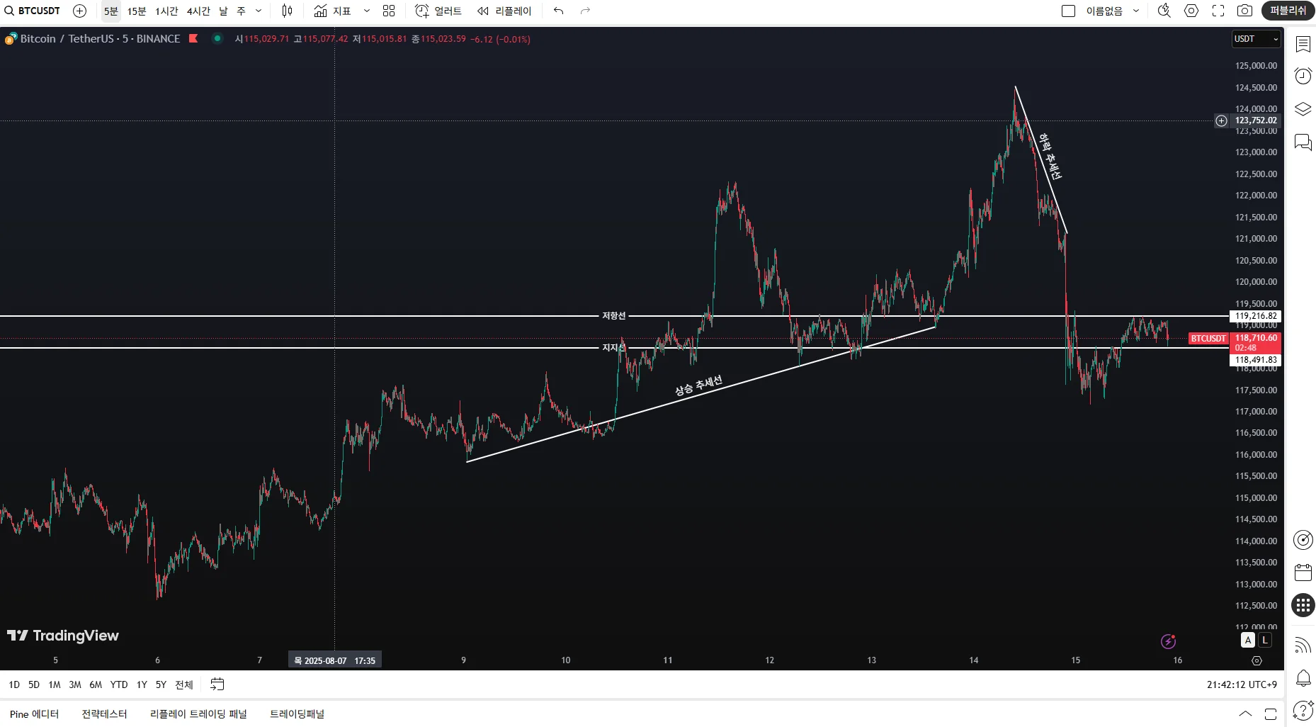 비트코인 5분 차트입니다. 저항선, 지지선, 상승 추세선, 하락 추세선 그려 봤습니다.