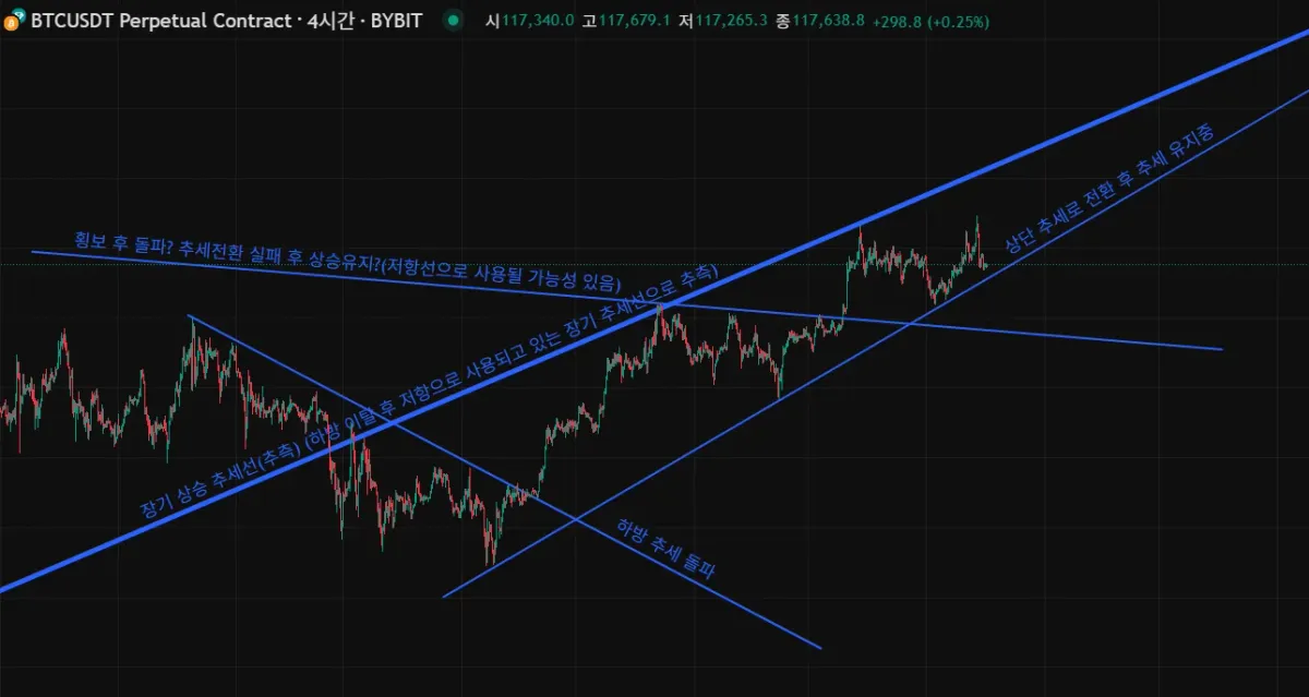 하방 추세가 돌파한 선은 의미 없는 선이 된 것 같지만 일단 배운 것들을 다 그려보고 싶었습니다. 걸러내는게 많이 어렵네요