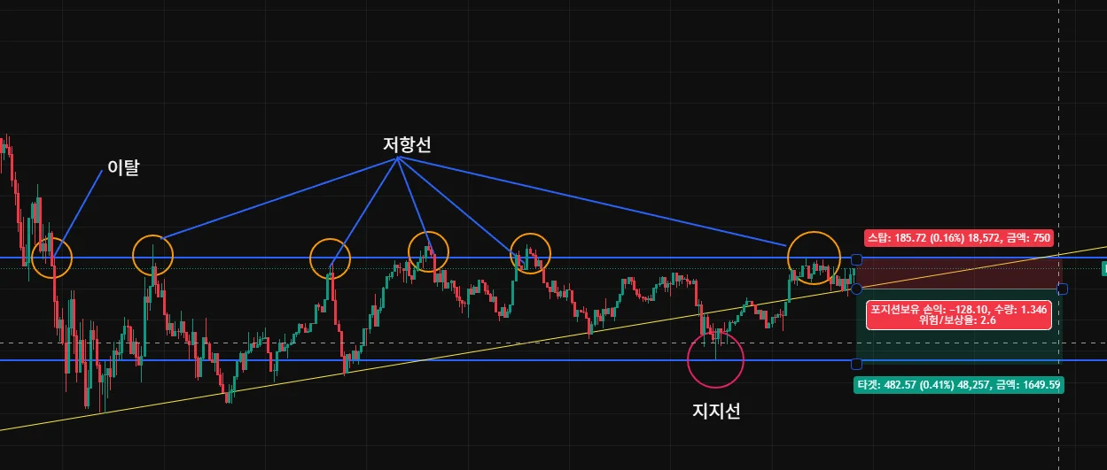 5분 기준으로 봤을 때 지지/저항 라인이 잡혀있고, 이탈 후 우상향 그래프로 봤을 때 캡쳐한 시점에서 다시 매수를 한다면 손익비구간이 나올 것이라 생각했습니다.