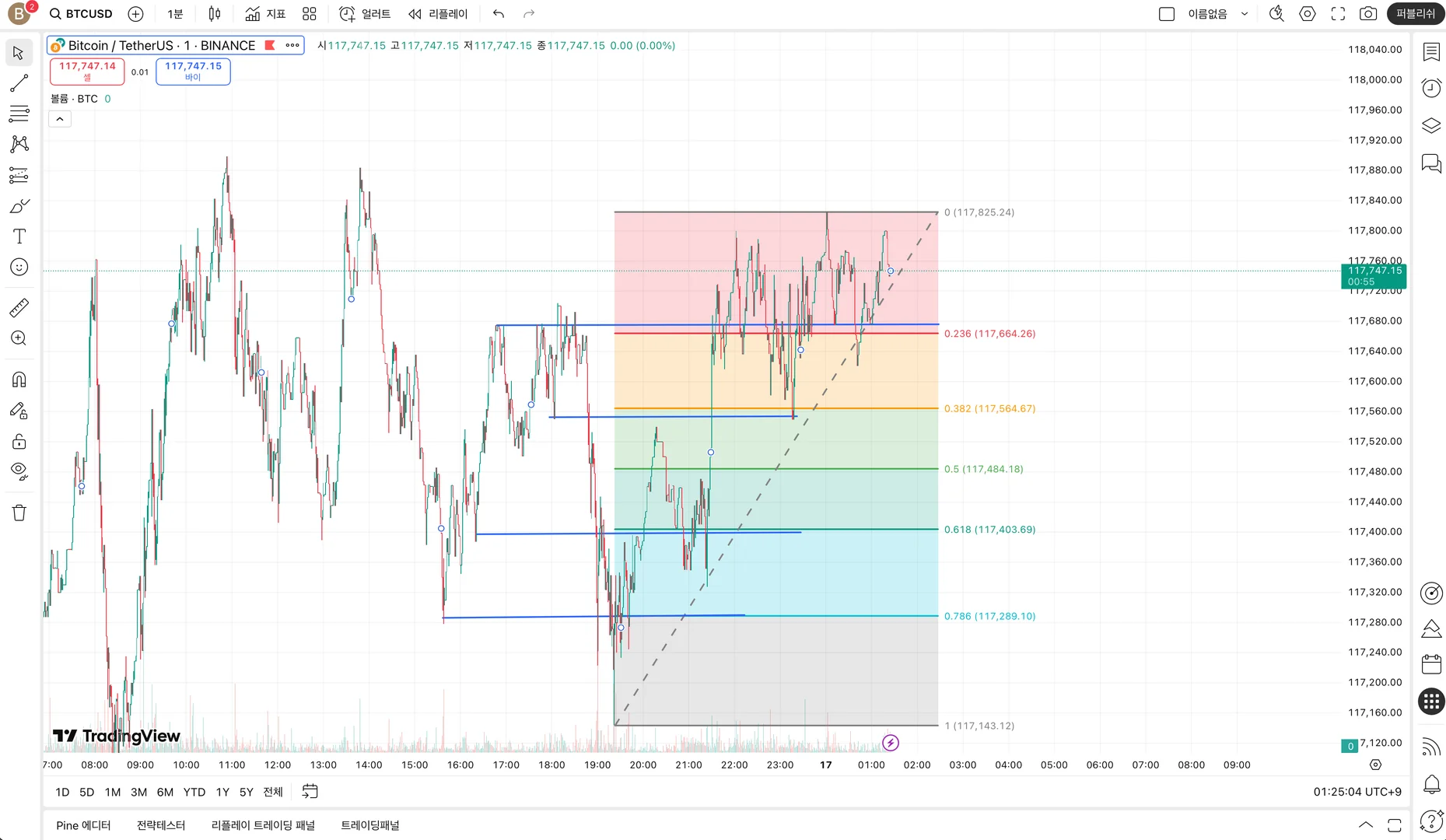 최근 저점(약 117,143) 에서 고점(약 117,825) 까지 상승한 흐름을 기준으로 피보나치 되돌림이 표시되어 있음.