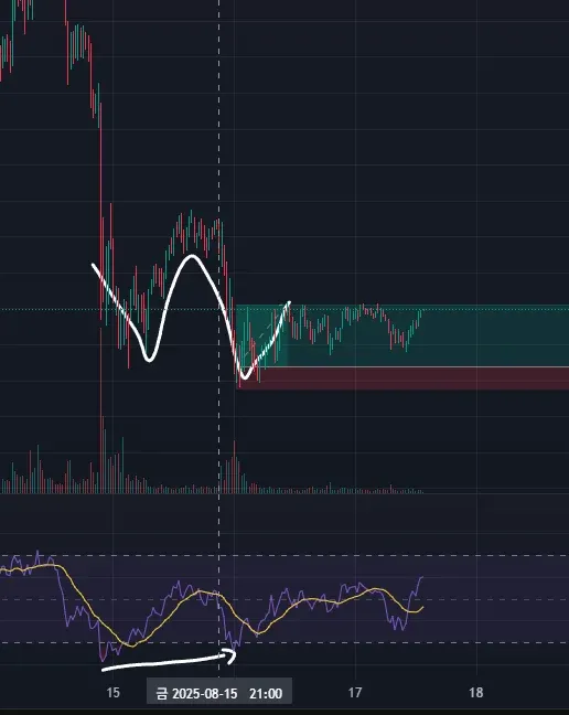 더블바텀이 나오고 RSI가 과매도 국면에 상승다이버전스가 나타나고 손익비가 좋아 롱 진입했습니다