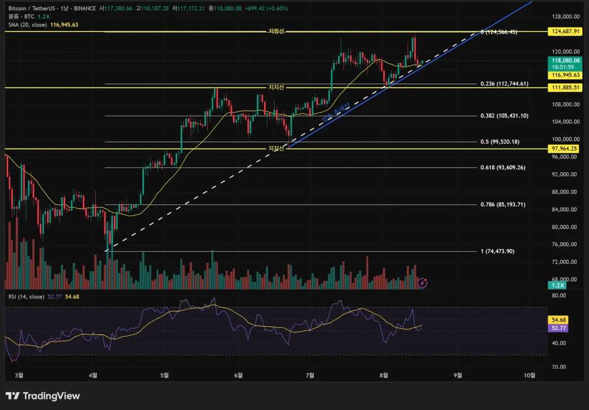일봉차트에서 지지저항선, 상승 추세선을 작도해 보았습니다. 피보나치 되돌림도 확인해 보고 싶어 작도 하였습니다.