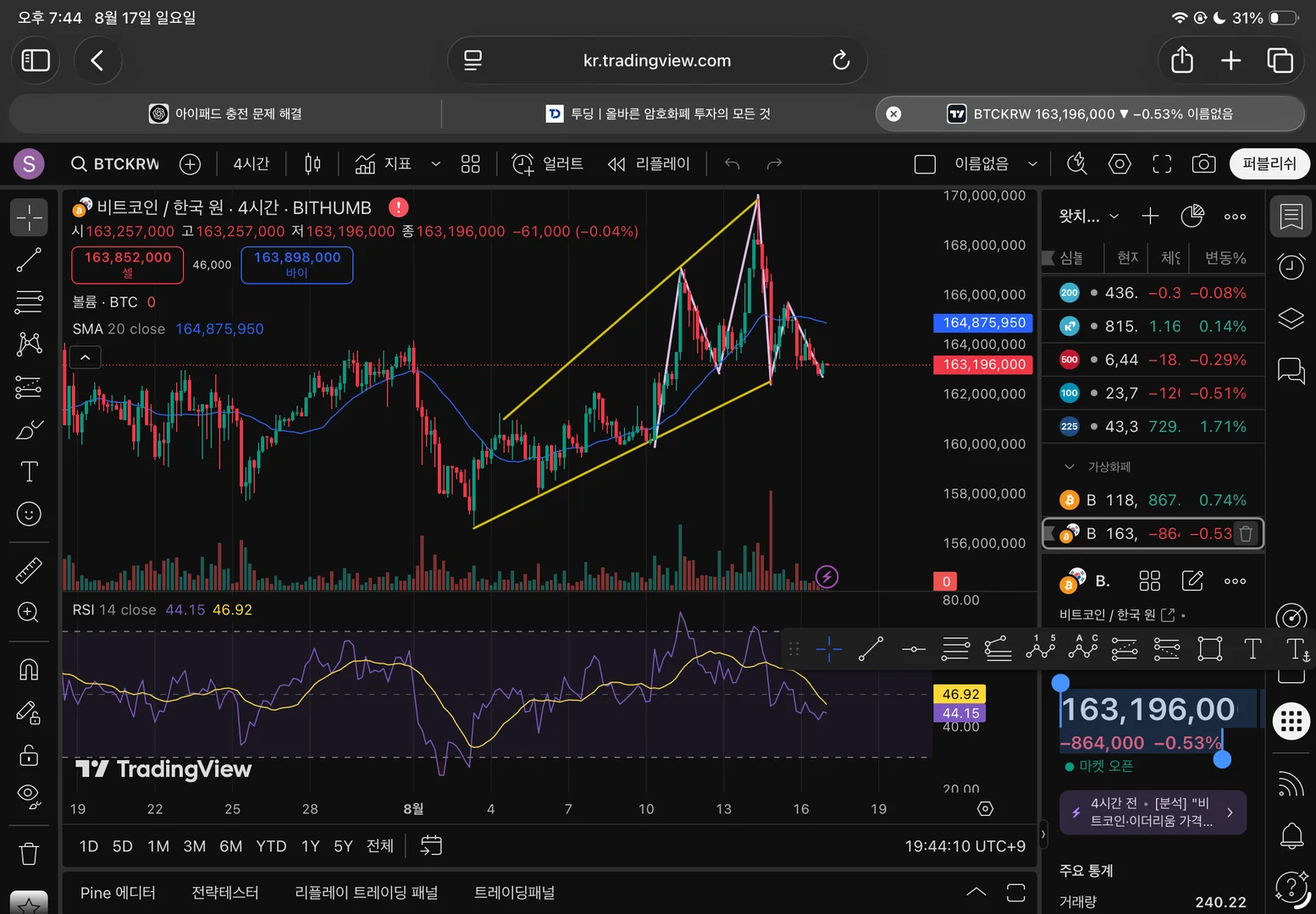 이렇게 하는게 맞는지는 모르겠지만, 가장 매수와 매도가 급격?하게 있던 부분들의 최저점과 최고점을 잇고, 그렇게 이은 선들을 한번 더 이어봤습니다
