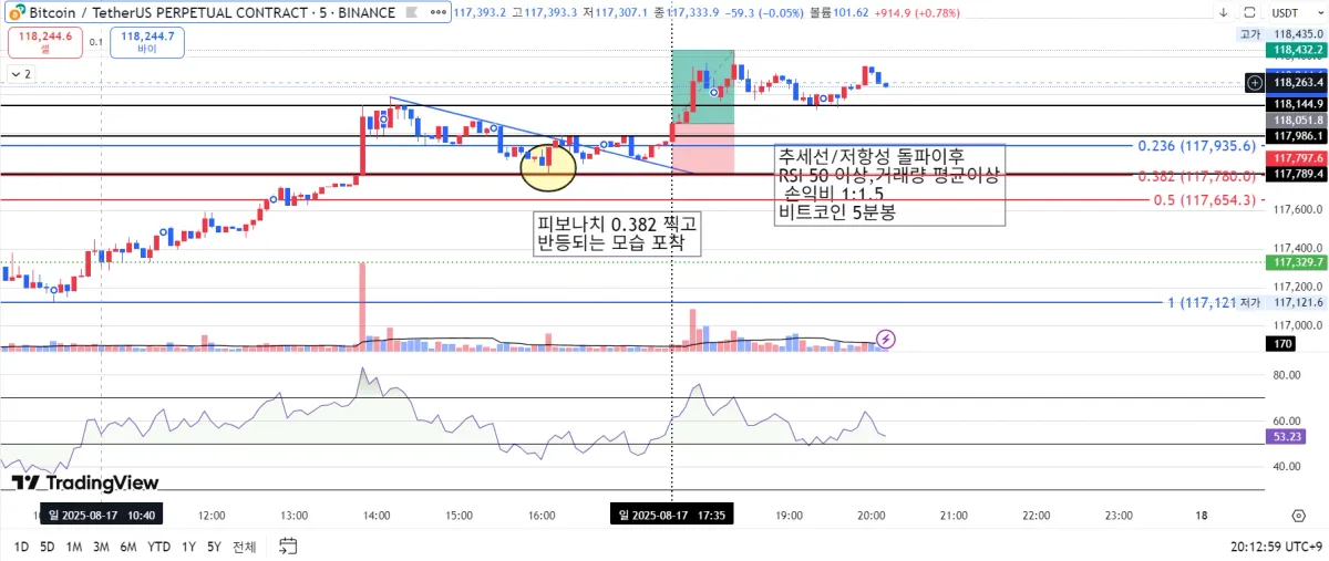 추세선 돌파가 두번 있었지만 바로 위 저항선을 돌파 하지 못하고 떨어지는 것을 보고 기다렸습니다. 거래량이 최소한 평균거래량을 넘기는 시점에서 RSI 위치를 확인하고 저항을 돌파해서 진입하고 손익비는
