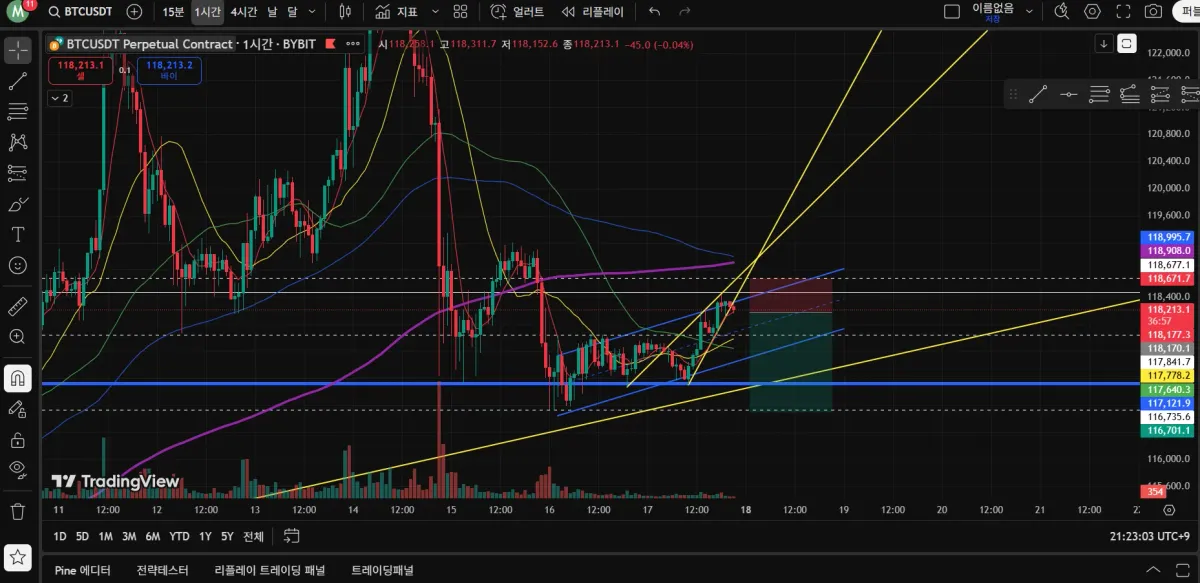 바이비트로 모의매매를 진행해봤습니다. 차트가 삼각수렴 패턴이 리테스트후 하락하는 모습과 감소되는 거래량을 보고 숏에 진입