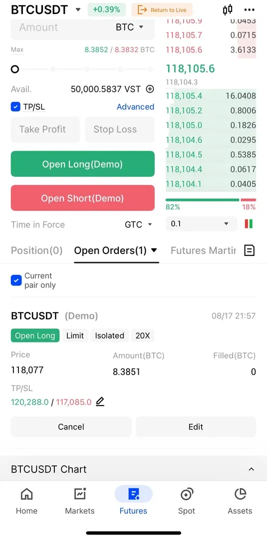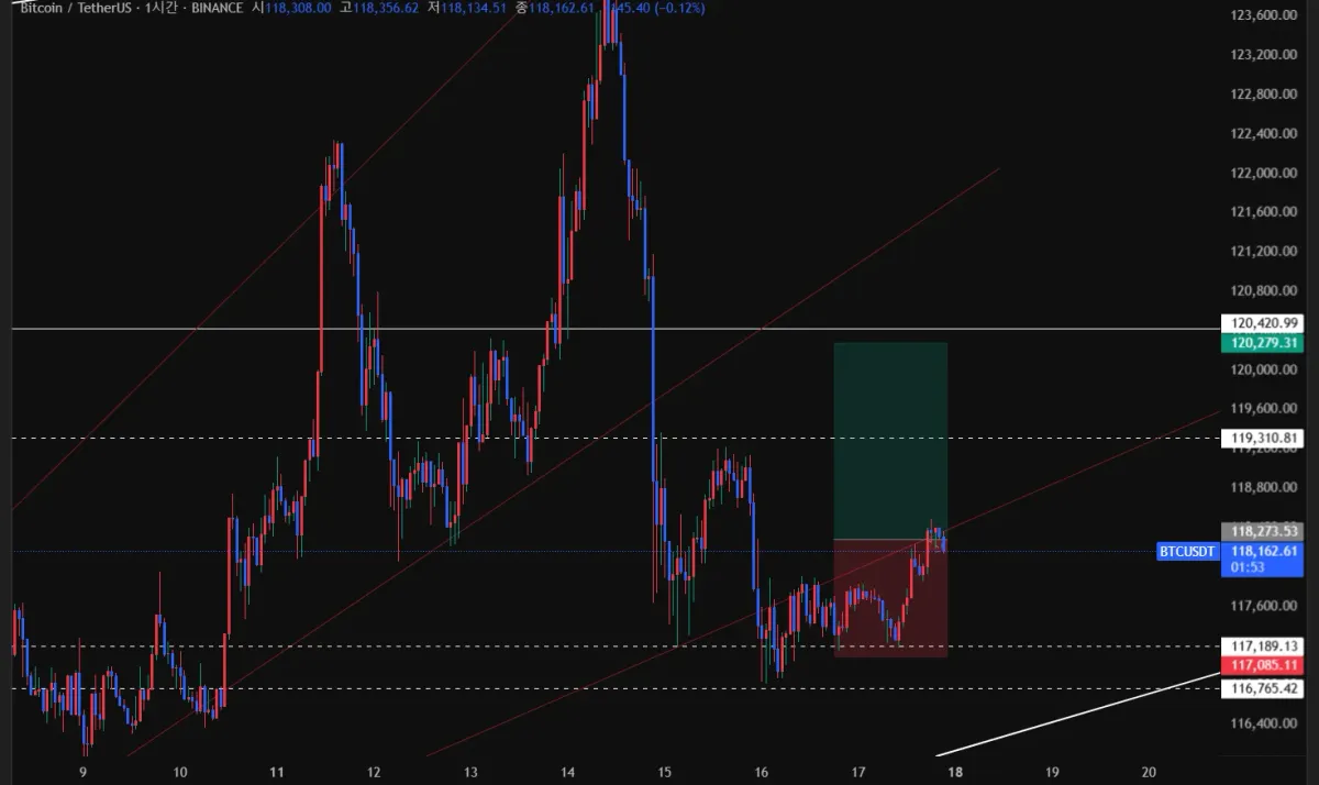 일봉, 4시간봉, 1시간봉에서 지지와 저항선, 추세선을 그려보고 1시간봉에서 지지선보다 아래에서 손절가를 정하고, 일봉에서의 저항선보다 아래에 익절가를 정했습니다.