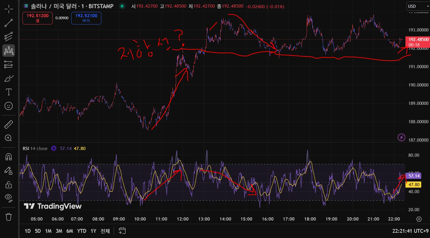 오늘 10시 쯤 RSI가 상승으로 보였고 이후 1~2시 쯤 RSI가 하락으로 바뀌어 추세가 전환되는 것을 확인했습니다