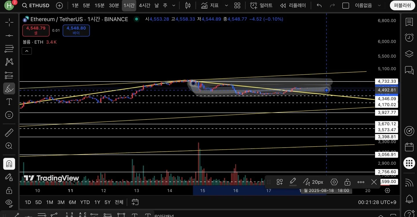 매매일지 미션을 해야해서 길게는 숏으로 들어가야하나 고민하다가 짧게 보고 들어가야하나 고민하고 들어갔습니다