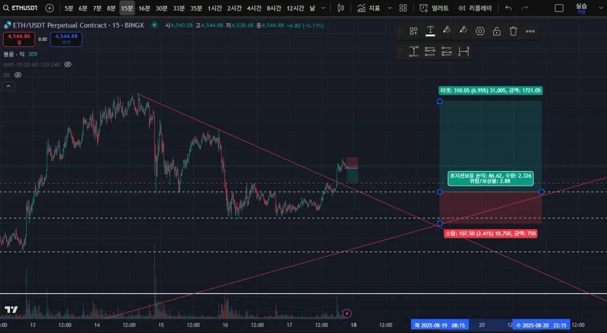 이더리움 1일봉으로 보면 상승추세 1시간으로 봤을때 단기 조정에서 하락추세를 깨고 상단 돌파를 하여 다시 지지선과 하락추세선에 리테를 하러 가지 않을까해서 진입시점을 4465 롱 손절은 전저점인 4371 익절은 4674 로 설정했으나