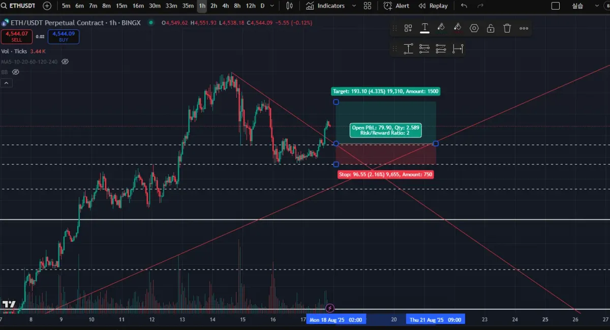 이더리움 1일봉으로 보면 상승추세 1시간으로 봤을때 단기 조정에서 하락추세를 깨고 상단 돌파를 하여 다시 지지선과 하락추세선에 리테를 하러 가지 않을까해서 진입시점을 4465 롱 손절은 전저점인 4371 익절은 4674 로 설정했으나