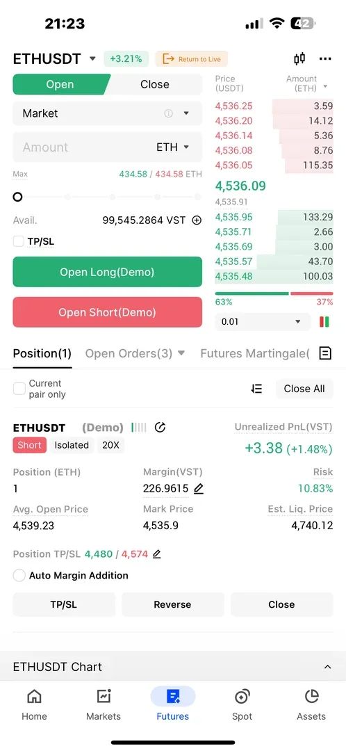 데모로 매매는 짧은 15분봉으로 1시간봉 진입시점으로 잡은 4465보다 좀 더 위인 4480 를 익절 포인트로 잡고 숏 포지션을 잡았습니다. 손절은 직전 고점인 4574로 짧게 잡았습니다. 아직 매매 진행중.