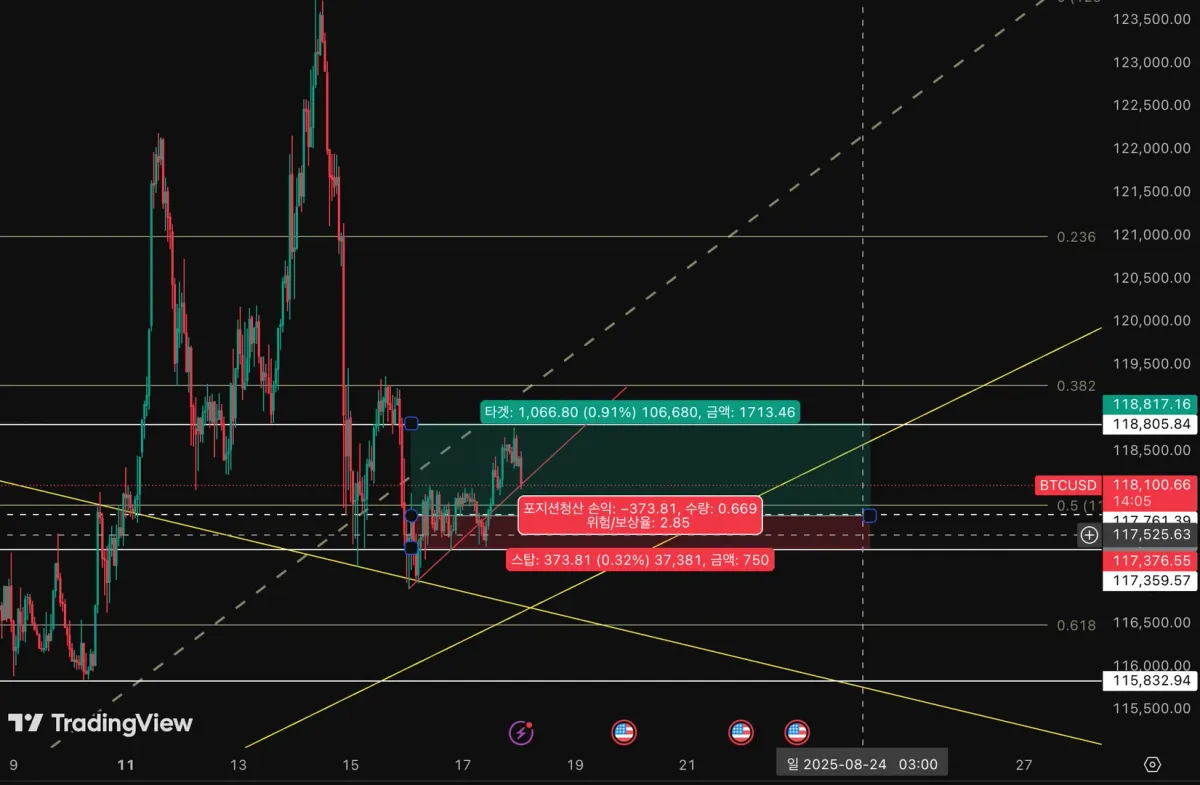 해당 차트는 1시간 봉이며 단기적으로 상승추세에 있다고 판단했습니다.