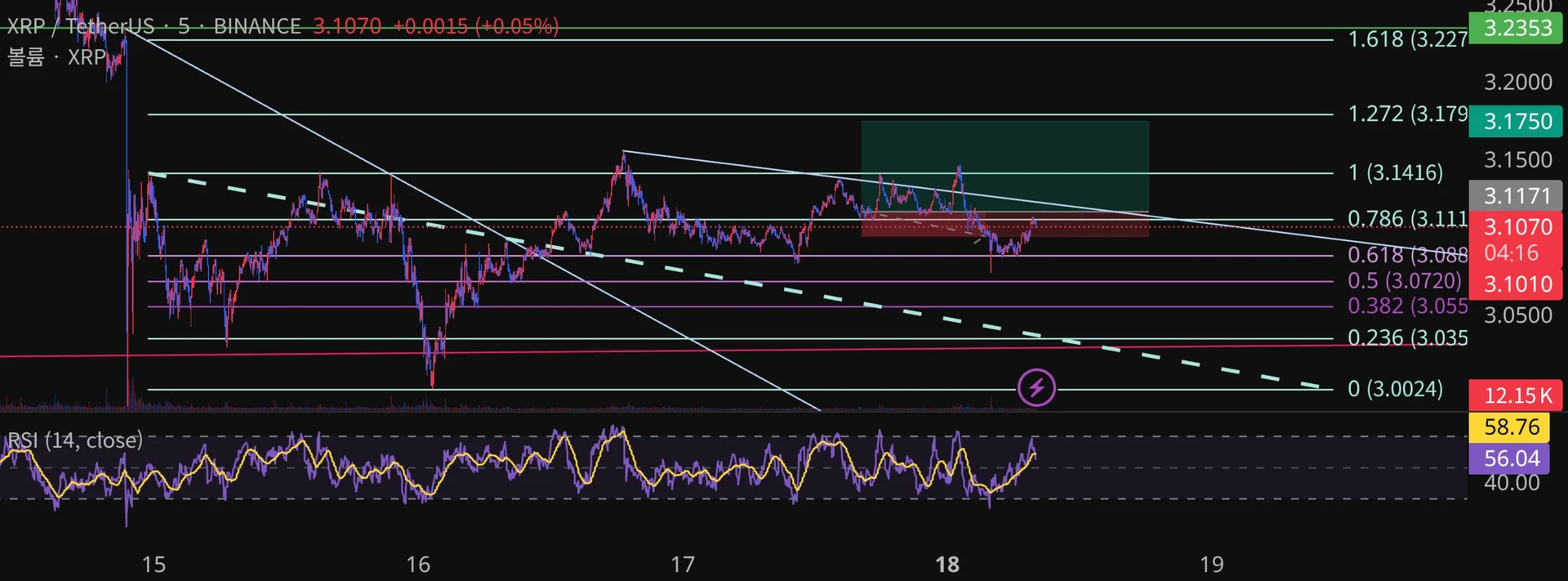 - 단기 하락 추세선이 보이지만, 일봉 피보나치 채널에 닿고 반등을 보여주고 있기에 상승 기대감