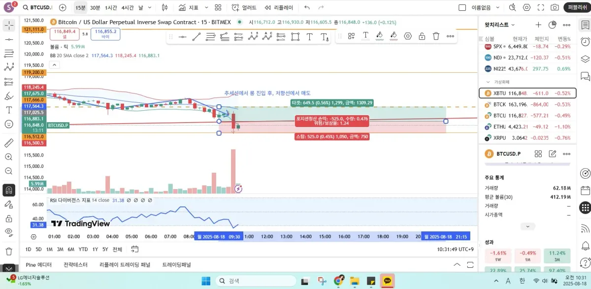 다우이론으로 하락 파악했으나, 전체 추세선이 상승에 RSI 지표가 30대로 과매도로 판단하고, 상승이 있을 것으로 예상